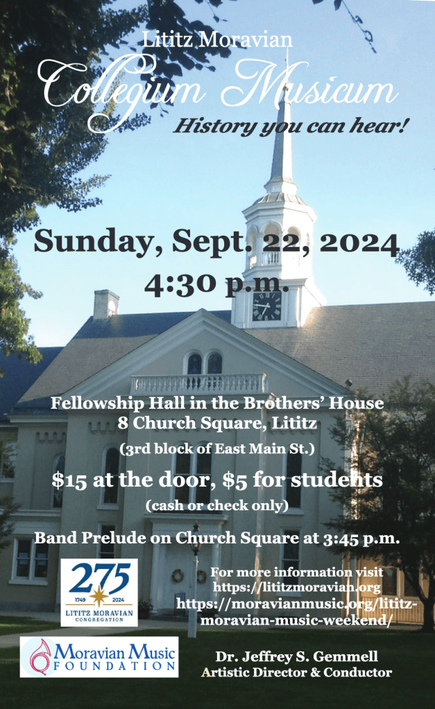 The Moravian Music Foundation (MMF), with offices in Winston-Salem (NC) and Bethlehem (PA), has sponsored Moravian Music Weekends in various locations for years. These events are filled with opportunities for choral and instrumental musicians of all levels and abilities to come together in harmony and fellowship. Participants learn some new music and enjoy some old favorites as well. For the first time ever, to celebrate the Lititz congregation’s 275th Anniversary, a Lititz Moravian Music Weekend took place at the church from September 21-22. Hosted and sponsored jointly by MMF, the Lititz Moravian Congregation, and the Lititz Collegium Musicum, educational workshops, stimulating rehearsals, engaging talks, and enjoyable local tours were offered. A public concert featuring the Collegium Musicum and festival ensembles culminated the enriching and fulfilling weekend.